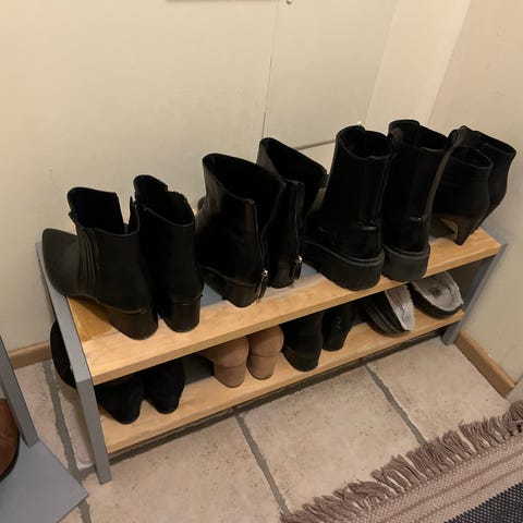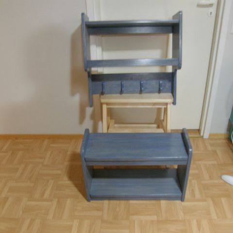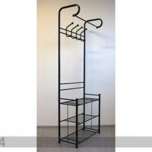Hyväkuntoinen, musta, metallinen naulakko kenkätelineellä.