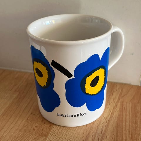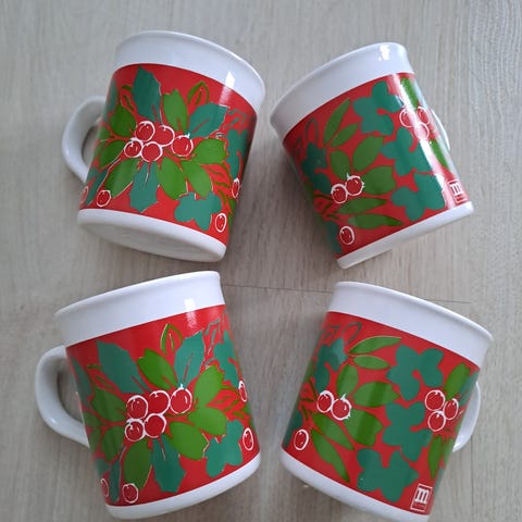 Kaksi Marimekon vanhempaa tuotantoa olevaa jouluteemaista mukia yhteishintaan 10 €.