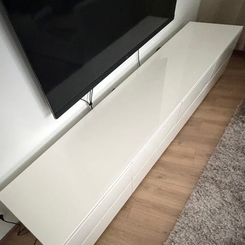 Hyvässä kunnossa oleva tv-taso Voice Arctic. 2 iso vetolaatikkoa ja liukuovi. Liukuoven takana lasihylly ja 2 reikää johtoja varten. Päällä paksu lasilevy. Valkoinen. Siistissä kunnossa. Paina paljon.