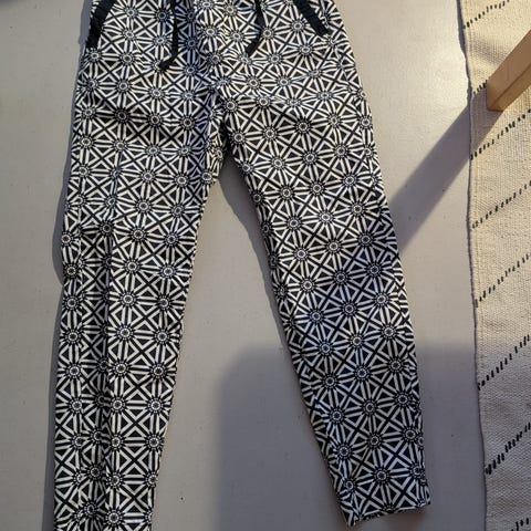 Lahkeen sisäpituus 74 cm. Lantio 46 ja vyötärö 35 cm. Rento istuvuus. Vuötärö jää navan alle.
