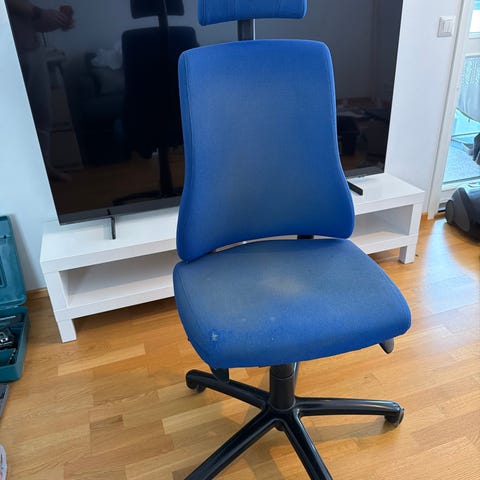 Vihreä erinomaisessa kunnossa oleva kangasverhoilu. Tuolissa on säätömahdollisuuksina korkeus, istuinosa, selkä- ja käsinojat. Toisessa käsinojassa on pieni vaurio (kuva), muutoin tuoli on erittäin hyvässä kunnossa.