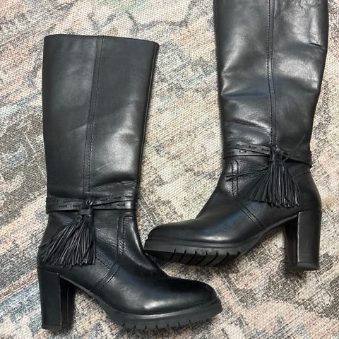 Saappaat koko 39. Saappaat ovat vihreän ja mustan väriset, materiaali ei ole tiedossa. Sopivat naisille.