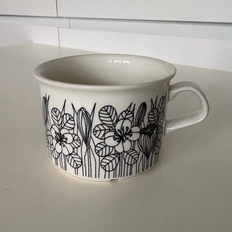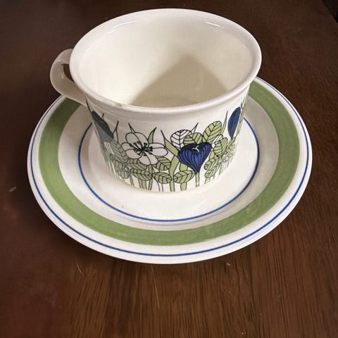 Löytyy yksi kahvikupin tassi, tassin halkaisija 15 cm. Väri vihreä. Kunto hyvä eli ehjä ja kirkasvärinen. Joku huomaamaton naarmu voi löytyä. Nouto Espoosta (voin tuoda moneen paikkaan) tai satunnaisesti Pasilasta. Lähetys ok.
