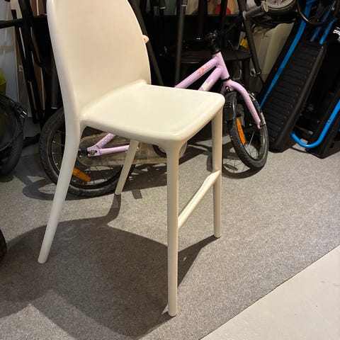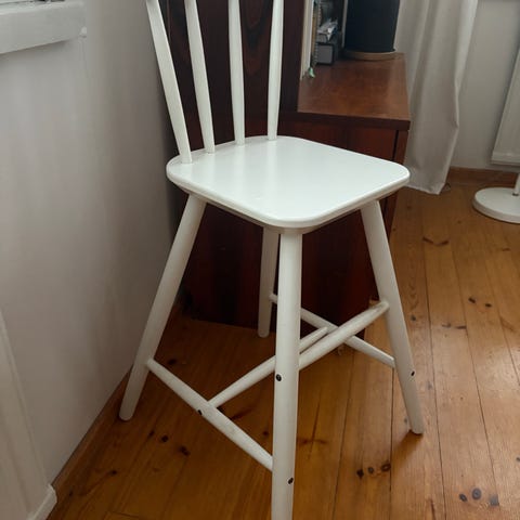 IKEA lasten tuoli valkoisella värillä. Tuolissa on mitat leveys 56 cm, syvyys 61 cm ja korkeus 82 cm. Istuimen leveys on 30 cm, istuimen syvyys 26 cm ja istuinkorkeus 54 cm.