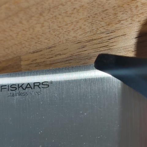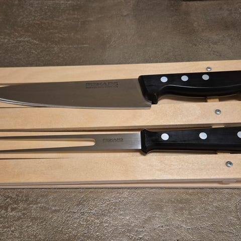Fiskarsin valmistamat lihaveitsi ja -haarukka omassa puulaatikossaan. Käyttämättömät. Vanhempaa tuotantoa.