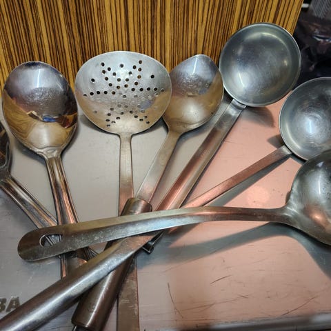 Ruostumattomasta teräksestä paketti keittiövälineitä, pieniä käytönjälkiä, mutta muutoin hyvässä kunnossa: