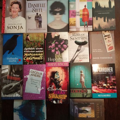 Kokoelma kirjoja, joissa mukana teoksia kirjoittajilta mm. Stieg Larsson, Tom Clancy, Jane Harper, Michael Connelly, Roslund & Hellström, Søren Sveistrup, Tuuri Heporauta ja Juha Vuorinen. Kirjat ovat pokkareita ja 2 viimeisessä kuvassa kovakantisia. Kaikki suomenkielisiä. Pokkarit 1€/kpl, muut 2€/kpl