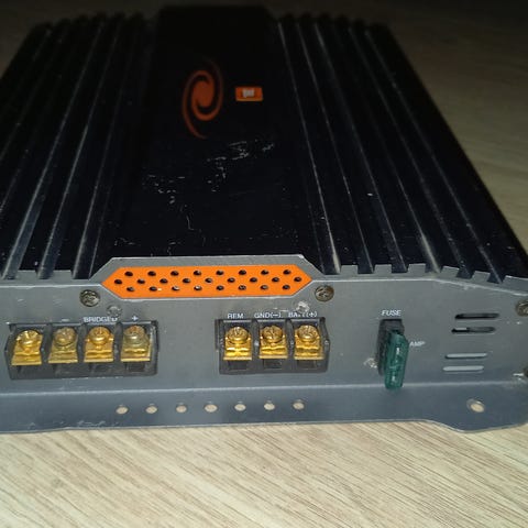 JBL P804 autovahvistin, jossa on useita liitäntöjä ja säädettäviä tasoja. Laite sisältää sulakkeet ja on suunniteltu käytettäväksi autokaiuttimien kanssa.