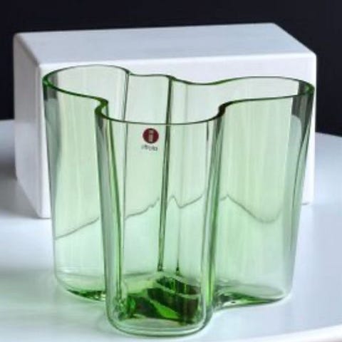 Iittala Aalto maljakko sinisenä. Maljakko on valmistettu lasista ja siinä on aaltoileva muotoilu. Korkeus 160mm.
