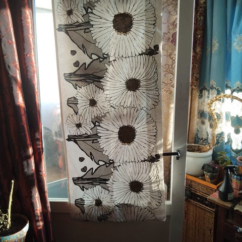 Siistikuntoinen sivuverho tankokujalla/rypytysnauhalla.