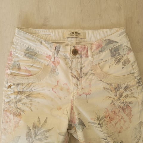 Mos Mosh housut, koko 38, harmaan sävyinen, mustia ja ruskeita ruutukuvioita. Housuissa on vetoketjulliset taskut ja säädettävä vyötärönnyöri.