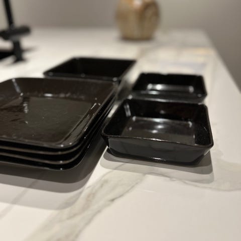 Keltainen neliönmuotoinen tarjoiluastia (ehkä 60-luvulta), ihan vähän kulumaa