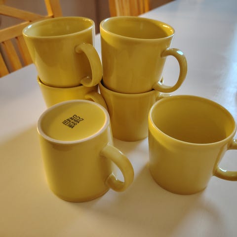 Vanhaa Arabia Teema/Kilta -sarjaa keltaiset lautaset ja neliö tarjoiluastia