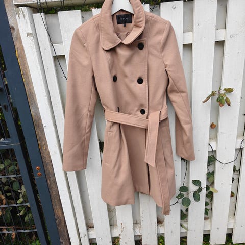 Vaaleanpunainen neppareilla kiinnitettävä villakangastakki (Vila). Pesulassa pesty. Villakangas hieman kulunut hihansuista. Nouto Tampere Hakametsä.