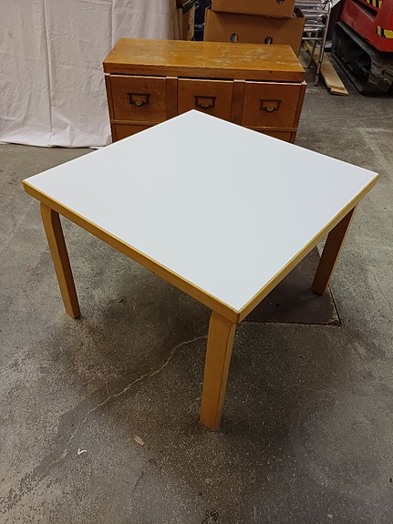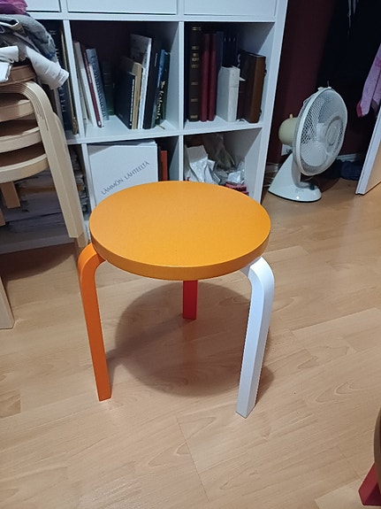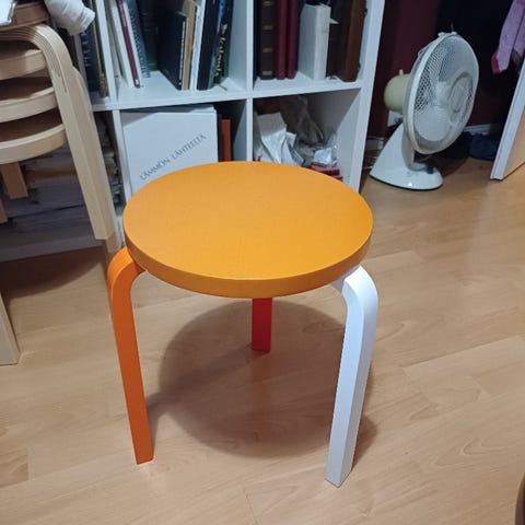 Artekin jakkara mallia 60, erikoisväritys puna-musta-valkoinen eli punainen kansi, jalat valkoisia + musta. Pientä käyttökulumaa. Tämän erikoisvärin alkuperää olemme selvittäneet Artekilta ja ilmeisesti kyseessä on ns. "customize your Aalto stool" -kampanjan puitteissa Artekin asiakkaalle tekemä kustomoitu väriyhdistelmä. Kunto erittäin hyvä, pientä käytönjälkeä, ks. kuvat.