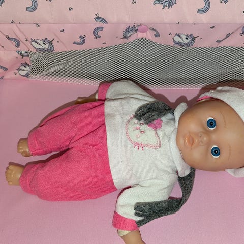 Erittäin hyväkuntoinen nuken hoitopöytä tarvikkeineen nukkeleikkeihin. Mukana pöytä alatasolla, pehmustekangas, potta, lelu ja tyyny.