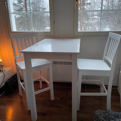 Tuote hyvässä kunnossa mutta yhdessä kulmassa pinta vähän kolhulla. Tukevat tuolit ja pöytä.