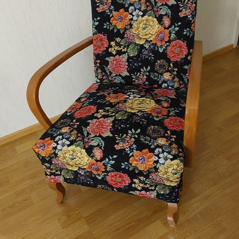Punainen kankainen nojatuoli, jossa on pyöreä muotoilu ja puiset jalat. Sopii olohuoneeseen tai muihin oleskelutiloihin. Hyvä kuntoinen,ehjä.