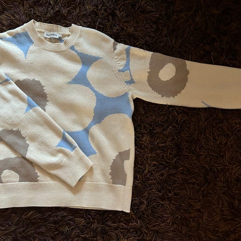 Myydään hyväkuntoinen Marimekon Tikru lokki -neule. Värit on haalea lila ja luonnonvalkoinen. Koko on XS mutta reilu. Eli on ns oversize. Koiratalous. En mittaa.