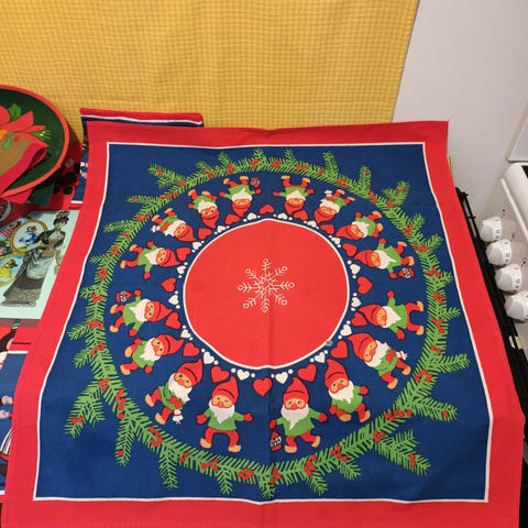 Jouluinen pöytäliina. Tonttu aihe. Koko 140x120 cm. Puhdas ja ehjä. 60-luku.