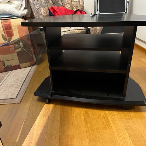 Musta tv-taso hyllyllä ja lasiovella. Pyörät alla. Sijaitsee Keravalla. Leveys 70cm syvyys 36cm korkeus 46cm juu juu