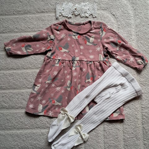 1. Jouluinen punainen mekko sydänkuviolla, materiaali veluuri, helmassa pitsi, merkki Lindex, kokomerkintä 74. Hyvä kunto.