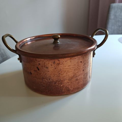 Myydään kuvien iso, vanha, patinoitunut kuparikattila. Halkaisija noin 24 cm, korkeus kannen kanssa noin 13 cm. Kahvan pituus noin 21 cm. Kunto ok, vrt. kuvat. Nouto Helsingin Lauttasaaresta tai postitus ostajan laskuun (ToriDiili).