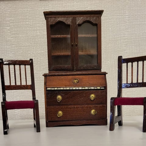 Todella hyväkuntoiset mahonginvärinen puinen kaapisto ja kaksi tuolia.