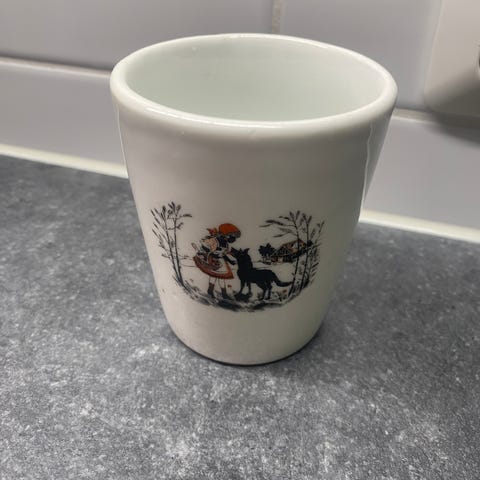 1950 luvun muki tekstillä Hupsu kylpöö jotta nahka palaa. Tällä kuva aiheella tuoppeja vähän myynnissä.