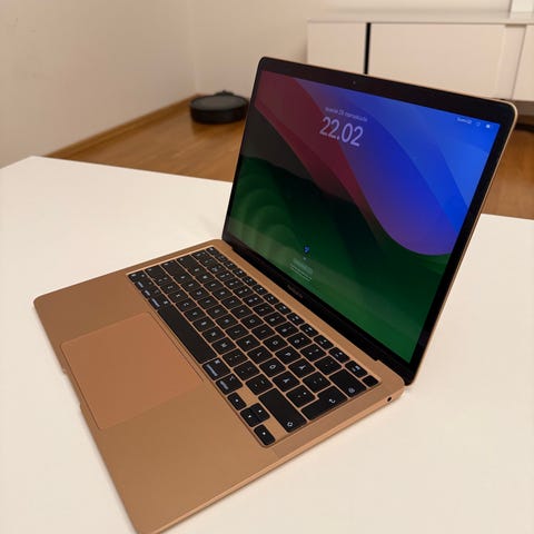 Apple MacBook Air kannettava tietokone, värinä roosa kultainen. Laite tarjoaa kevyen ja ohuen muotoilun, sopii monipuoliseen käyttöön kuten opiskeluun ja työskentelyyn.