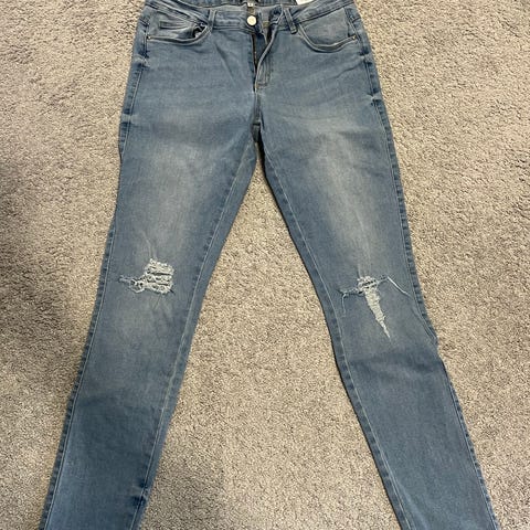 Myydään naisten vaaleansiniset, korkeavyötäröiset strech farkut. Koko 32/32.