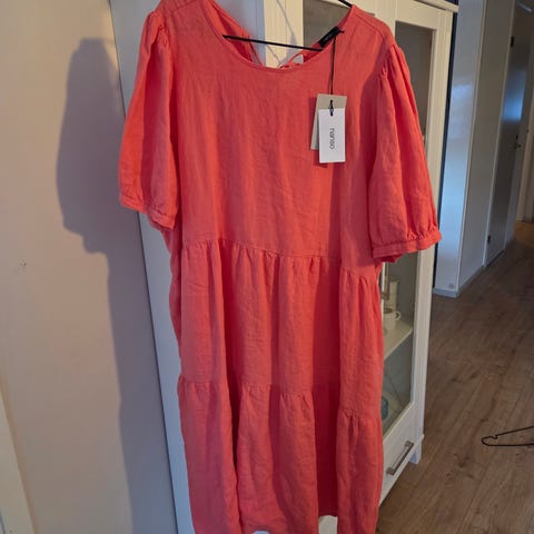 Nanson sarastus mekko. Mekko on valmistettu pellavasta ja väriltään beige. Mekko on kokoa XL. Tämä on midi malli mekosta ja siinä lyhyet hiat, pyöreä pääntie, sivutaskut. Mekko on uusi ja käyttämätön. Tuotteen voi noutaa ja myös lähetys onnistuu