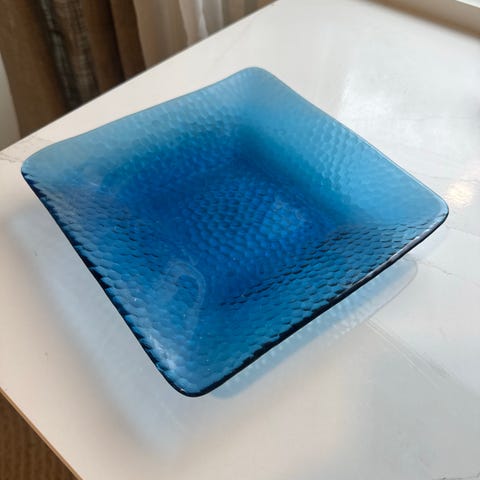 Kaunis, sininen Pentikin tarjoiluastia kuvioitua lasia. Koko 29x29cm.