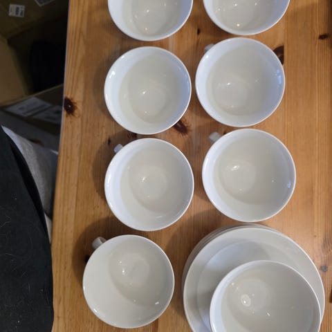 Vähällä käytöllä ollut, vain juhlahetkinä joskus käytetty astiasto. Kuppeja 6, lautasia ja asetteja 8. Lisäksi tarjoilulautanen, sokerikko ja kermakko. Myös nouto sopii. Tällä hetkellä Evijärvellä, mutta ensi viikolla vien Treelle, mistä voi myös noutaa. Samoin toisen myynnissä olevan astiaston.