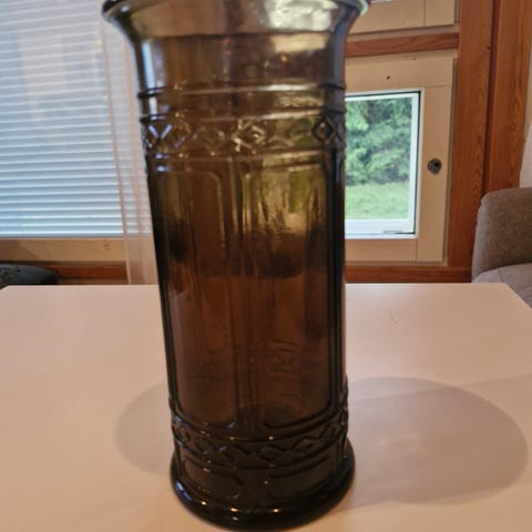 Riihimäen lasin ruskea Arki maljakko. Suunnittelija Hans Nyqvist. Halkaisija 10 cm ja korkeus 21 cm.