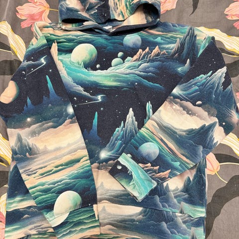 Pojan lempihuppari, uutena kappahlista ostettu, paljon käytetty. Laadukas collegehuppari, ei nukkaa oikein ollenkaan mutta pieniä hailuja tahrajälkiä on mm. etutaskussa, taskun yläpuolella, hihansuissa. Taskun sauma pienesti revennyt, näkyy jos venyttää taskua. Lisäkuvissa mallia tahroista. Printti myös kulunut osin pois. Jos vauhtijäljet ei haittaa, tässä oiva huppari.