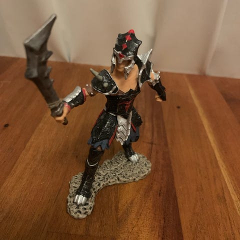 Kaksi erilaista fantasiateemasta inspiroitua hahmofiguuria. Toinen hahmo on roomalaisvaikutteinen sotilas kypärällä ja kilvellä, toinen hahmo on tumma, koristeellinen velho tai demoniasekseen pukeutunut hahmo, jolla on sinivihreitä yksityiskohtia ja ase. Sopii keräilyyn tai leikkiin.