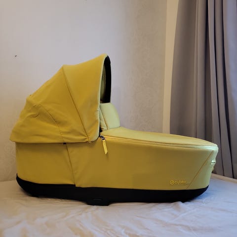 Cybex Priam Lux CC R lastenvaunukoppa harmaalla kankaalla (Manhattan Grey). Ehjä ja siisti. Juuri ja juuri havaittavissa kopan päällä pientä tummaa jälkeä, näkyy kuvassa. Valkoiset sisäpehmusteet pesty hajusteettomalla pesuaineella.