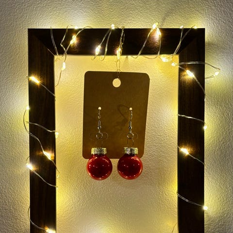 Myydään käyttämättömät koukulliset joulukuusenpallo korvakorut silikonitaustoilla. Korun pituus noin 6,5 cm ja leveys 1,8 cm. Materiaalina matta punaisen värinen lasipallo sekä Suomessa testattu nikkelitön, lyijytön ja kadmiumvapaa ruostumaton teräs. Kaikki materiaalit on ostettu suomalaisista turvallisia korunosia ja joulukuusenpalloja myyvistä kaupoista.