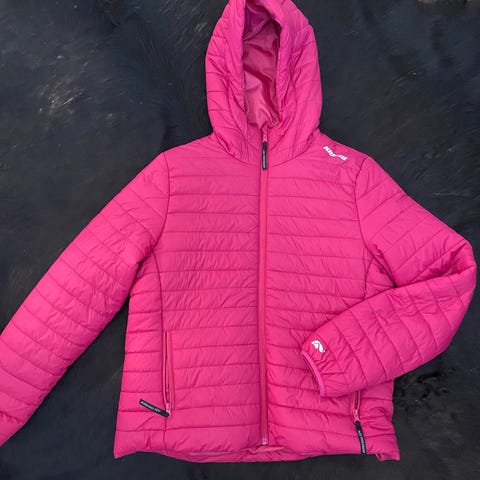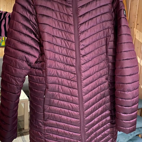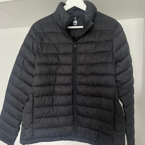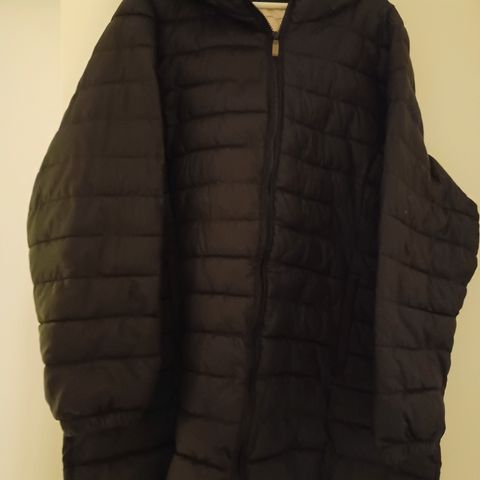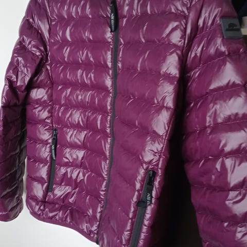 Naisten kevytvanutakissa on kiinteä huppu ja kaksi vetoketjullista taskua. Koko L (40).