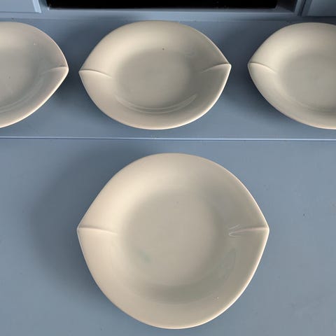 Hienon keväisen värinen. Kevät sarjan lautaset muistuttavat puun lehtiä. Astioiden pohjassa teksti Kevät Pentik Finland ja signeeraus R.R eli Raino Ranta.