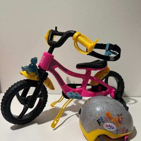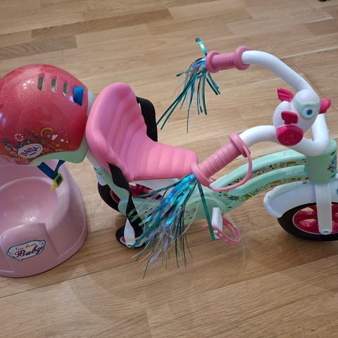 Myydään Baby born pyörä ja isosisko-nukelle kuuluva pyöräilykypärä. Uutena ostettu.