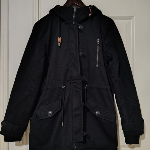 Jeane Blush naisten musta talviparkatakki koko M. Käytetty paljon, mutta silti hyvä kunto. Kuminauhakiristys helmassa ja vyötäröllä. Lämmin takki. Ryppyinen kun laatikossa säilytetty. Huppu kiinni vetoketjulla ja karvareunus neppareilla. Lisäkuvia saa pyydettäessä.