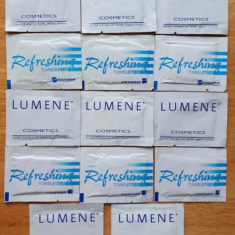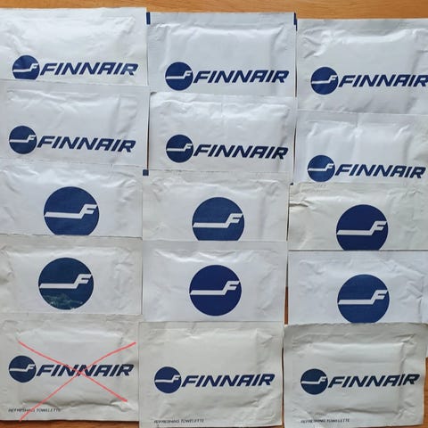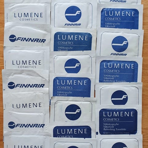 Myydään Finnair kosteuspyyheet, 14 kpl. Yhteishinta 35 euroa, voi ostaa yksittäin 3 e/kpl. Taloudessa ei tupakoida eikä kotieläimiä. Nouto tai postitus.
