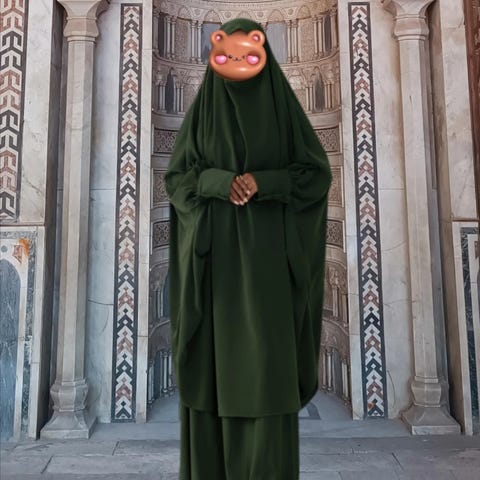 Tosi hyvässä kunnossa käytetty vain muutaman kerran. Yläosa ilman hametta. Korkealaatuista kangasta, made in France. Ei venyvää kangasta. Myynnissä myös kaksiosainen tummanvihreä jilbab.