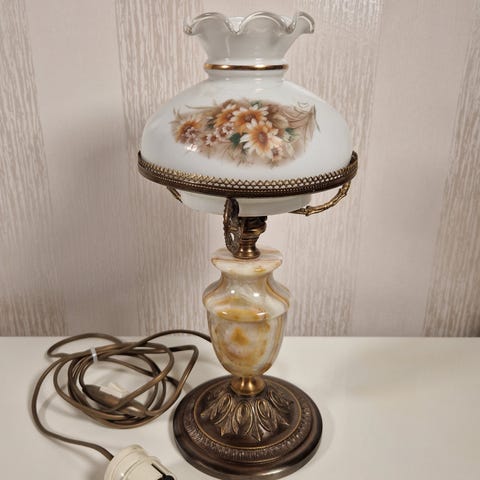 Kotimainen messinkiä oleva Sario pöytävalaisin. Sähköt uusittu. Varjostin parhaat päivät nähnyt, muuten tyylikäs valaisin.