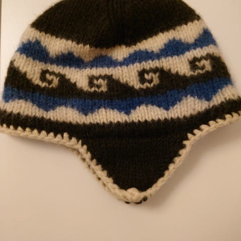 Villalangasta neulottu musta pipo. Mitta kuvassa.