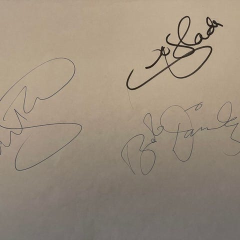 Bloodhound Gangin nimikirjoitukset saatu Provinssirockissa bändin lehdistötilaisuuden jälkeen vuonna 2000.