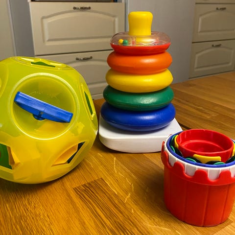 lajittelulelu sisältää muovisen sinisen säilytysastian ja värikkäitä muotoja, kuten tähtiä, ympyröitä ja kolmioita. Lelu on suunniteltu lasten motoristen taitojen harjoitteluun ja muotojen tunnistamiseen.
