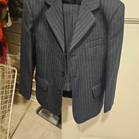 Pojan juhlapuku, takki koossa 110cm ja housut 116cm.